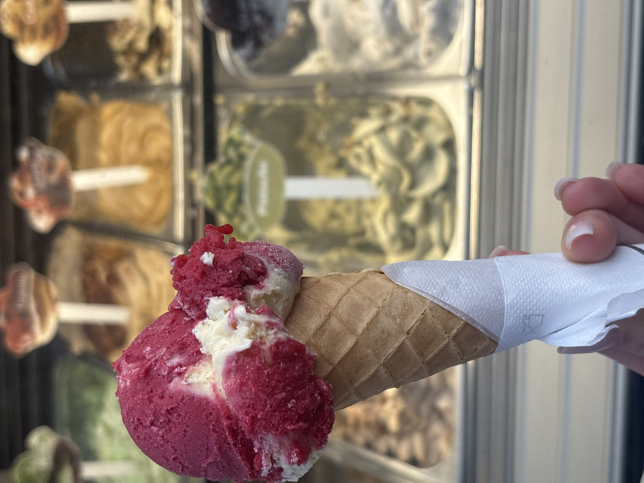 - "A close-up, slightly low-angle photograph depicts a person's hand holding a melting two-flavor gelato in a waffle cone, positioned against the blurred background of a commercial gelato display case in Nice, France" by FM-tCzpu1, licensed under CC BY 4.0