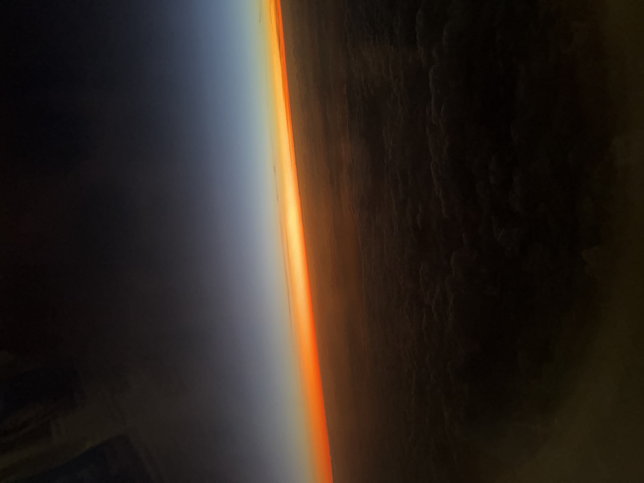 An oblique shot captures a striking atmospheric scene. A vibrant orange-red band marks a division between two distinct areas. To the left, a gradation from a dark tone into a lighter bluish-grey dominates, suggesting clear sky and the upper atmosphere. To the right, a textured darkness reveals what seems to be a cloud cover. The dramatic lighting and stark contrast create a powerful visual effect.