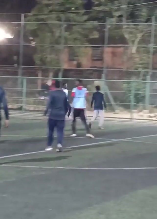 Several individuals are engaged in a nighttime soccer game on a well-lit artificial turf field. They are wearing a mix of casual clothes and soccer jerseys, and are actively running and passing the ball. The field is enclosed by a green fence with trees visible in the background. Above the field is a bright light source providing illumination.
