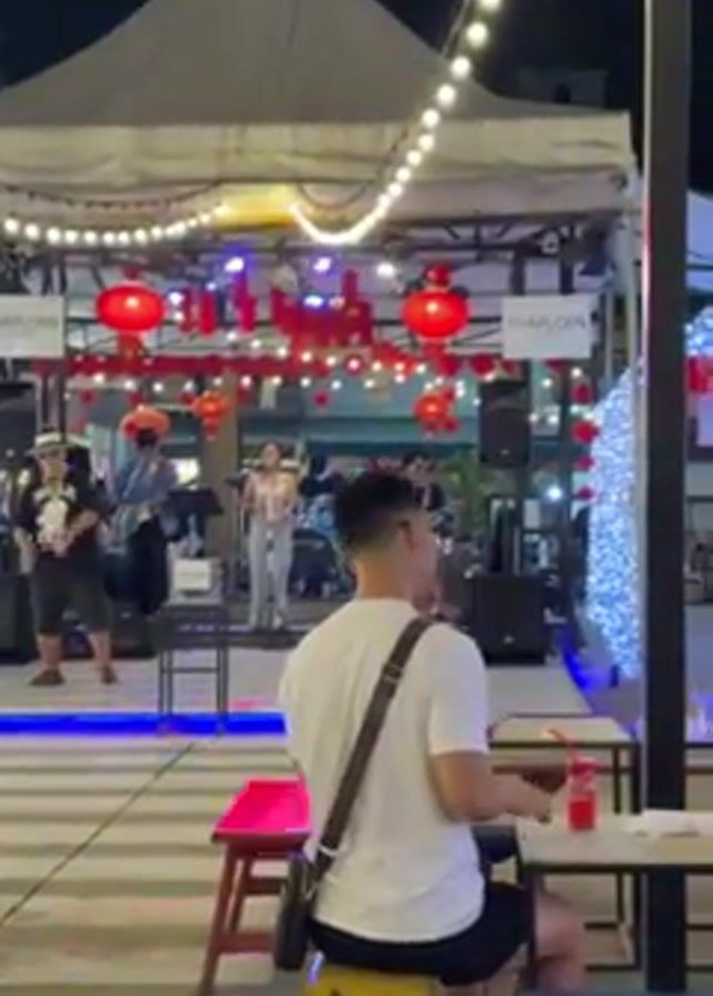 n outdoor venue at night, with a live band performing on a small stage. The stage is decorated with strings of lights and red Chinese lanterns. A man is sitting at a table, facing the stage, watching the performance. He is wearing a white t-shirt and black shorts, and has a satchel-type bag slung over his shoulder. There are drinks on the table in front of him. The band consists of a female singer, a guitarist, a drummer, and a man playing some type of horn. There are a couple of other people standing or milling around the stage area. The ground is paved with what looks like zebra-striped tiles. There is a tent-like structure covering the stage area. The overall atmosphere is festive and lively. A person walks into the frame on the right side near the end.