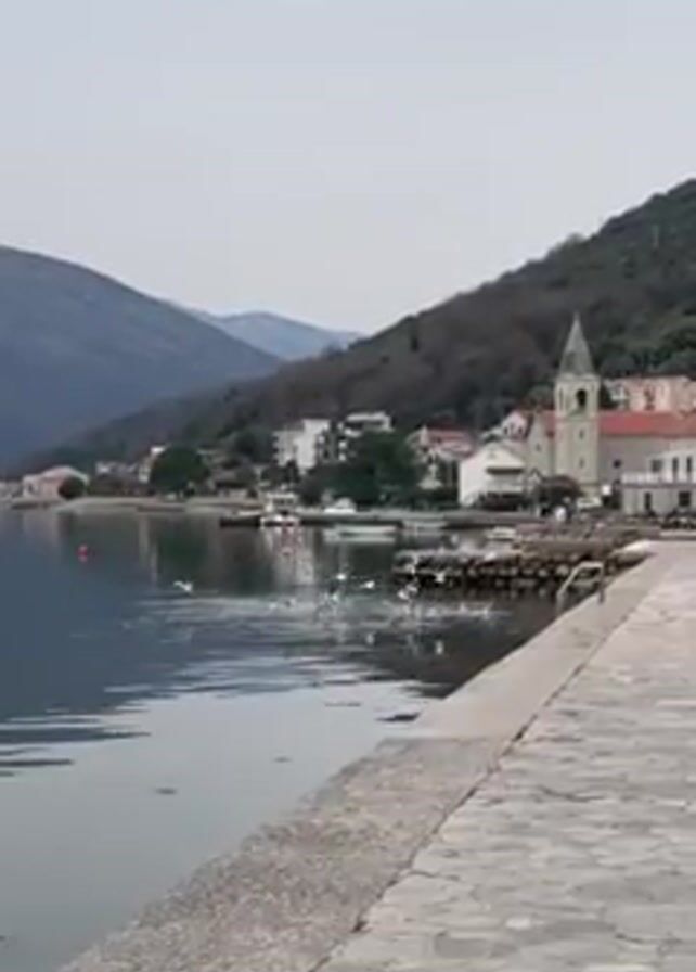 The video presents a picturesque view of a seaside town. A stone-paved walkway runs along the bottom of the frame, beside a body of water. White seagulls are the focal point, some swimming on the water's surface while others are in mid-flight, contributing movement to the scene. Across the water, a small town is nestled against a green, tree-covered hillside. Buildings of various sizes can be distinguished, including a church with a steeple. In the distance, a mountainous range is silhouetted against a pale, overcast sky.