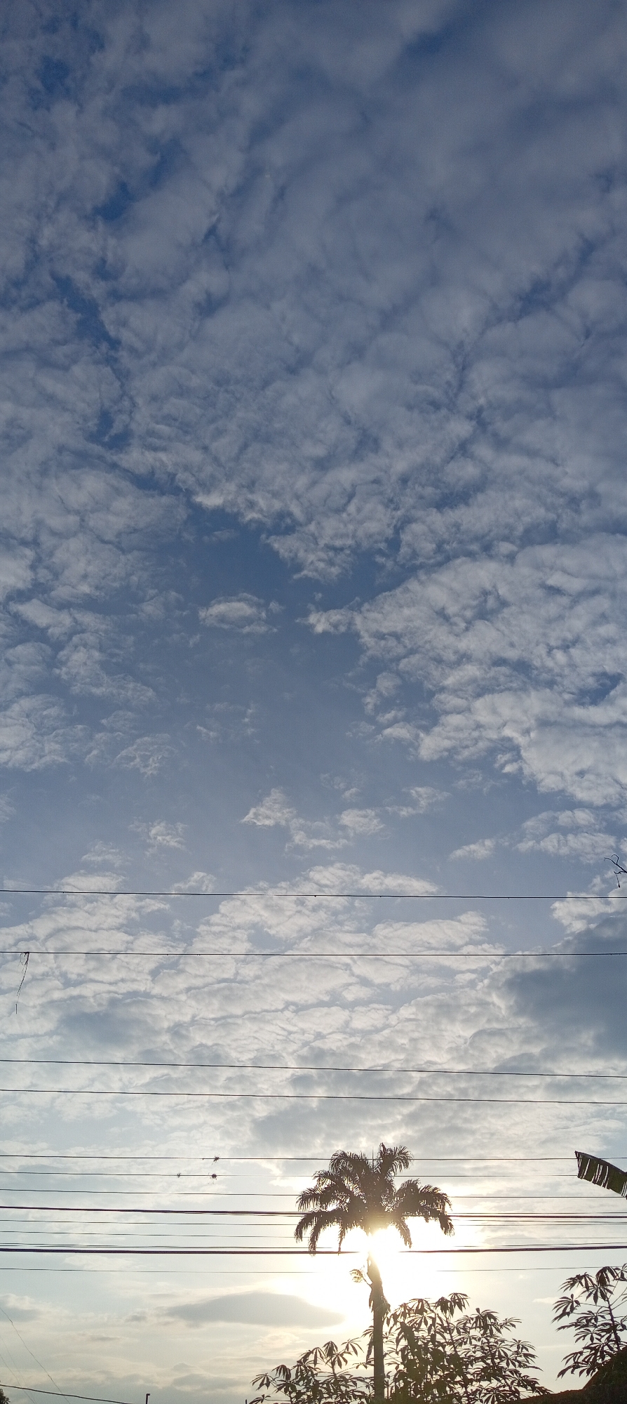 daytime scene in Tinaquillo, Venezuela, with a focus on the sky and a partial view of the landscape below. The sky is predominantly blue, with scattered altocumulus clouds. Power lines extend horizontally across the lower half of the image. Silhouetted against the bright sky is a palm tree, its trunk partially obscured by the sun. In the foreground, there are additional leafy plants.