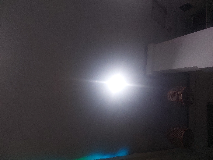 A nighttime interior view captures a ceiling with a bright light fixture as its focal point. The light casts a strong glare, obscuring details. Beneath, a wall features two hanging wicker baskets stacked vertically. A blue-green hue is visible along the lower edge, possibly reflecting light. A partially visible air conditioning unit is mounted near the ceiling. The image has a dark, somewhat grainy quality, with the intensity of the light dominating the scene.