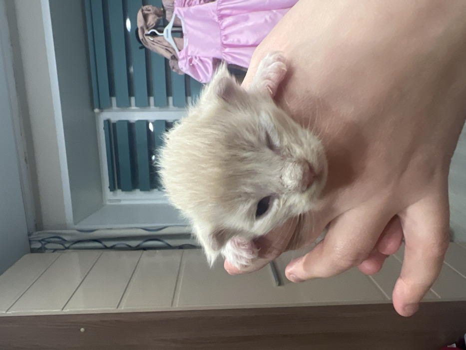 - "A light cream-colored juvenile feline is centrally positioned, supported by a human hand" by FM-Ke9ym1, licensed under CC BY 4.0