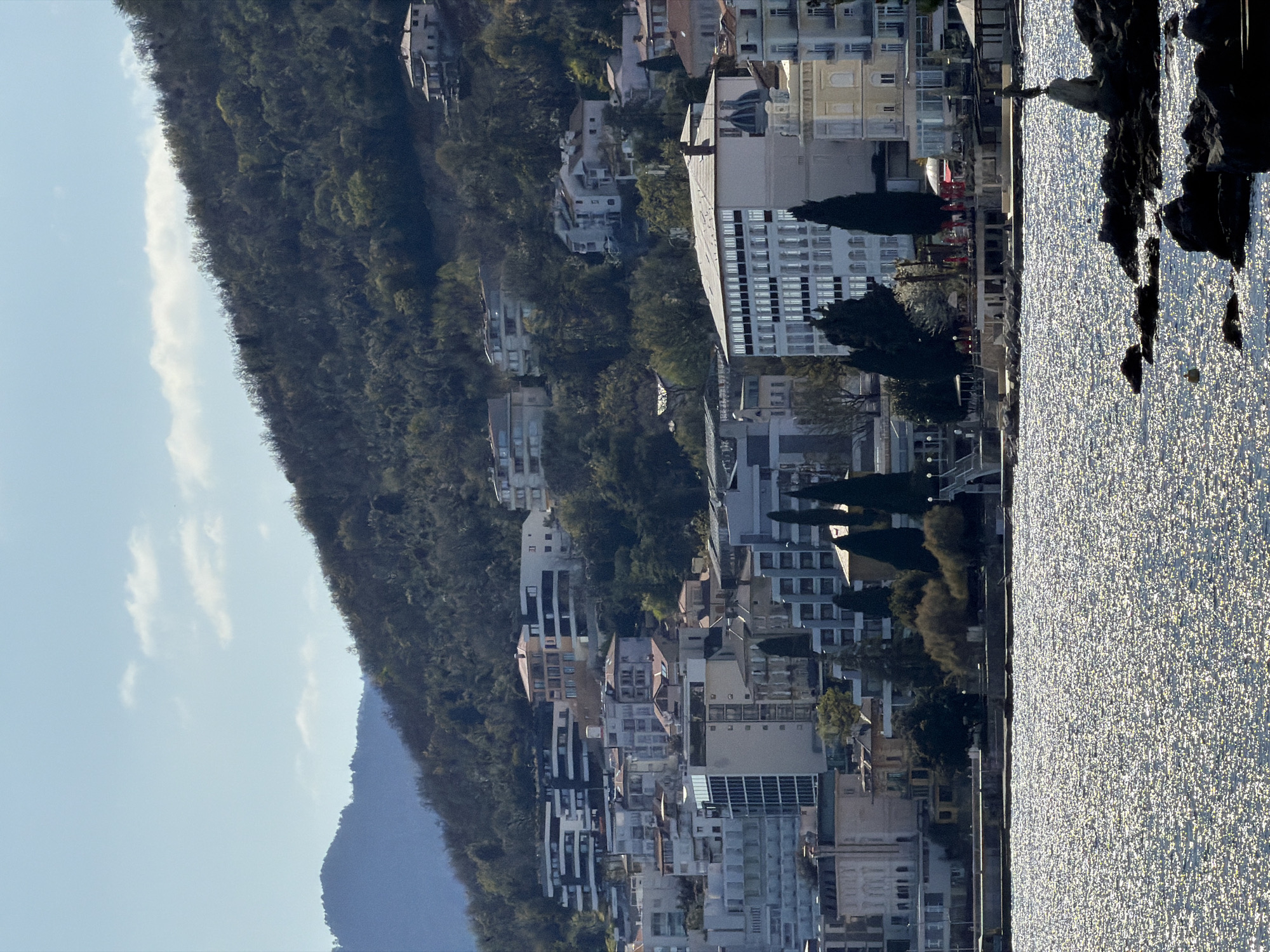 The image depicts a panoramic view of the coastal city of Grad Opatija, Croatia, observed from the sea, looking towards the shore. The sky is a light blue with scattered, wispy white clouds. In the background, a steep, densely forested mountain range, likely part of the Učka nature park, rises prominently, covered in dark green deciduous and evergreen trees. Numerous residential structures, including multi-story modern apartments and traditional houses with light-colored facades and terracotta roofs, are built into the hillside, ascending from the coast and interspersed among the trees. The foreground is dominated by a body of water, the Adriatic Sea, exhibiting a sparkling, shimmering surface due to direct sunlight reflecting off numerous small waves. Several dark, jagged rocks break the water's surface in the lower right and center foreground. Positioned on a prominent rock outcropping slightly right of center is a dark statue, identifiable as the "Maiden with the Seagull," facing seaward. A single yellow buoy is visible in the water to the left of this rock formation. Along the coastline, a paved promenade or walkway runs horizontally. Directly behind this, a continuous line of buildings forms the urban waterfront. These include multi-story hotels and other structures, displaying a mix of architectural styles from historic grand buildings with ornate details (e.g., domed roofs, elaborate facades) to more modern, rectilinear designs with extensive windows and balconies. Many buildings have light-colored exteriors. In front of some structures along the promenade, outdoor seating areas with multiple red umbrellas and tables are visible, indicating commercial establishments like cafes or restaurants. Dark green, tall, slender coniferous trees (cypress-like) and other smaller bushes are strategically planted along the promenade and around the buildings. No distinct individuals are discernible in the scene.