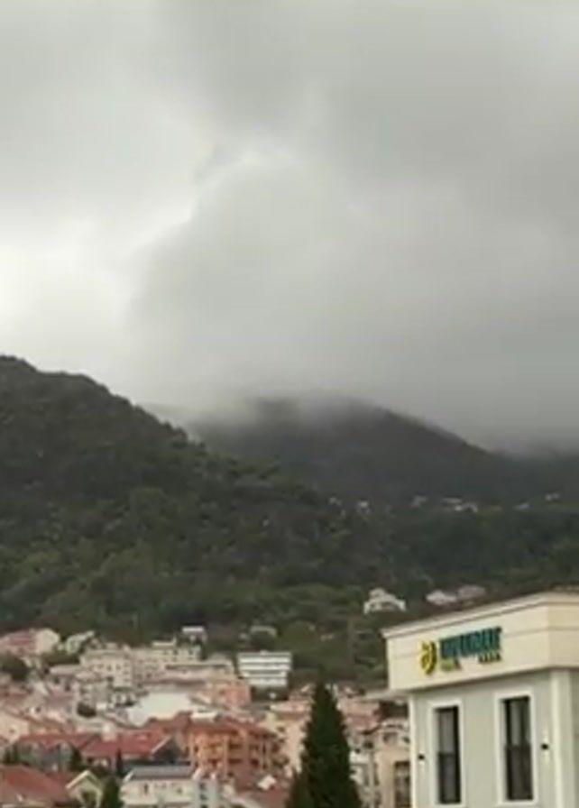 The video presents an overcast cityscape. In the foreground, the corner of a building is visible, marked with a green and yellow logo that reads "Diplomat Park." Below this building is a view of other buildings in the city, mostly constructed of light-colored stone. Behind the city, there's a large hill or mountain densely covered in green trees. The upper part of the hill is obscured by a thick layer of low-hanging clouds, contributing to the gloomy atmosphere.