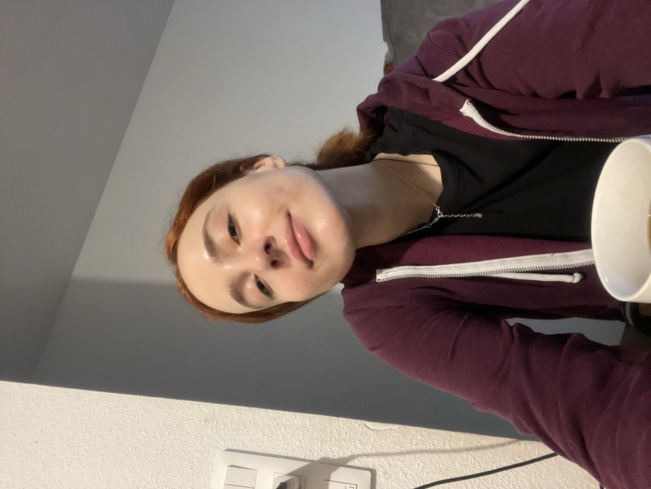 female individual indoors, located in the city of Strasbourg, France. She is positioned slightly to the right of the frame's center, observed from the chest up, and looks directly at the camera with a subtle smile. Her hair is reddish-brown and appears pulled back. She wears a dark-colored t-shirt underneath an open, maroon-colored hooded sweatshirt with a light-colored zipper. A silver-toned necklace with a small pendant is visible around her neck. In the lower right foreground, a white ceramic mug containing a dark liquid is partially visible. The background consists of a textured, light-colored wall on the left, featuring a white wall-mounted electrical outlet with visible wiring. To the right, a smoother, darker grey wall indicates an interior corner. The lighting suggests an indoor setting.