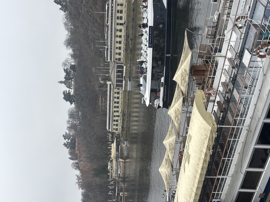 An overcast, high-angle view captures a section of the Vltava River in the Capital City of Prague, Czechia. On the distant, treed hill, identified as Vyšehrad, a prominent red-brick fortification wall is visible on the left, while a building with an ornate, gilded onion dome, recognized as the Church of St. Mary Magdalene, stands on the right. The trees on the hillside appear bare. Along the river's far bank, a long, light-colored building complex, likely the Výtoň customs house and adjacent structures, features numerous windows and a central columned portico. A chimney on this building emits a plume of white smoke. Behind this complex, several large tour buses are parked. A smaller, modern-looking building is visible further left along the bank, and a small, light-colored dinghy floats in the river near the bank. In the mid-ground, a dark-hulled passenger boat named "MARIE D'BOHEMIA," operated by "PRAGUE BOATS," navigates the river. Its upper deck is occupied by approximately fifteen individuals, wearing casual clothing and jackets, standing or seated in rows of white chairs. The lower deck is enclosed with large windows. In the foreground, the upper portion of a larger, stationary passenger boat is visible. Its upper deck is equipped with numerous empty wooden benches and tables. A white canopy, branded "MATTONI," covers the forward section of this deck, while several beige, pyramidal parasols are deployed over the aft section. Multiple orange life preservers are attached to the white railing. No people are visible on this foreground vessel.