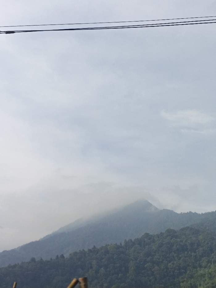 The image displays an expansive outdoor scene situated in Basedth, Cambodia, characterized by an overcast sky and a mountainous landscape. The upper portion of the frame is dominated by a light grey, cloudy sky. Two dark, horizontal electrical or communication lines traverse the upper edge of the frame. Below the sky, a range of forested mountains extends across the middle and lower sections of the image. These mountains are largely obscured by dense fog or low-lying clouds, particularly around their peaks, creating a hazy appearance. The visible slopes are covered in dark green, dense tree canopy. The extreme bottom edge of the foreground contains blurred, indistinct elements, including a yellow-brown object, possibly part of a fence or natural structure. No individuals, animals, or specific actions are discernible within the scene.