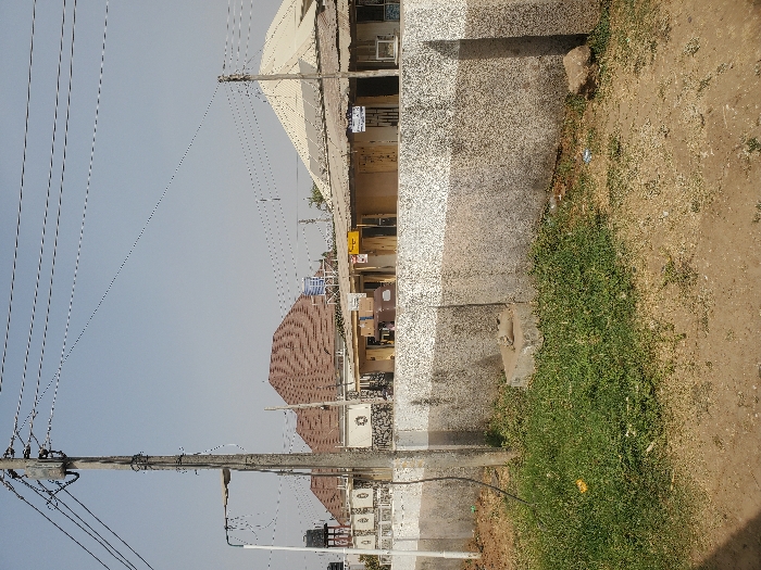 An outdoor shot captures a scene with a building and power lines. The building's architecture is visible, while the power lines create a web-like pattern against the sky. Adjacent to the building, there's a ground area with patches of grass and earth. The power pole stands tall with its cables, and its wires span across the image.