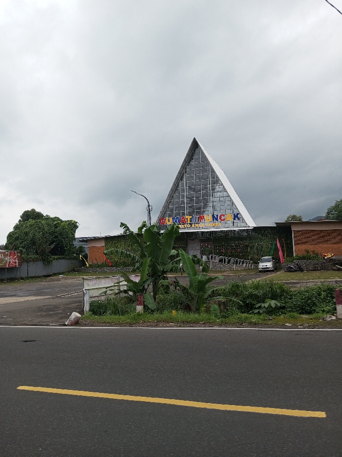 This image depicts an exterior view of a commercial or public building under an overcast sky, located in the city of Dawathang_Dorjibi_ Kashingtsawa, Bhutan. The prominent central feature of the building is a sharply peaked, triangular glass facade composed of numerous rectangular panes. Below this, a horizontal sign displays the colorful text "GUMAT PUNCAK" with smaller, partially obscured text beneath it. The building's lower section features a wall covered in dense green, possibly artificial, foliage, adorned with small colorful elements. To the left of the central triangular structure, a darker, flat-roofed section of the building is visible, alongside a partially visible red and white billboard in the distance. To the right, a section with a brown brick wall is present. A light-colored sedan is parked in a dirt parking area near an entrance ramp with handrails, situated on the right side of the main building's facade. A pile of logs or branches rests near the brick wall on the far right. In the foreground, an asphalt road with a solid yellow center line runs horizontally across the bottom of the frame. A grassy verge separates the road from the property. This verge contains several large banana plants, other dense green vegetation, and a white and red marker post. A utility pole or lamppost stands between the vegetation and the building. No people are visible in the scene. The overall lighting suggests a cloudy or dull day.