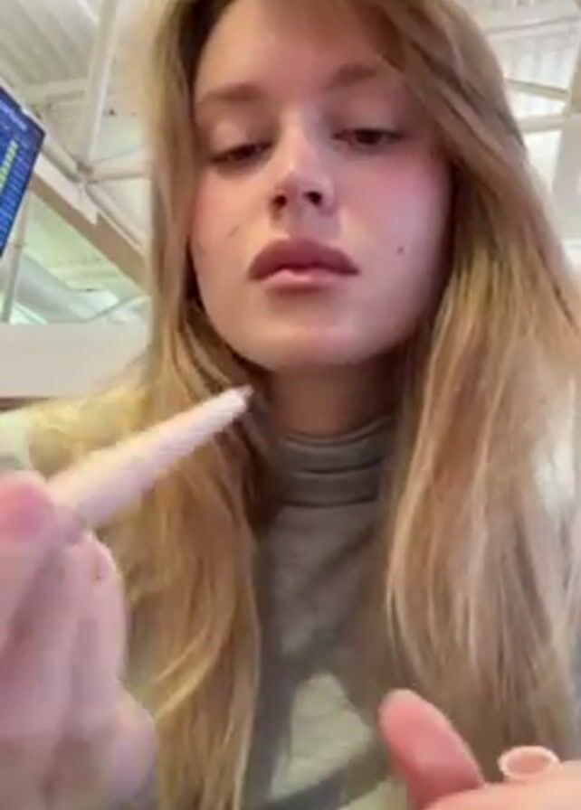 A young woman with blonde hair is applying lip liner in what appears to be an airport waiting area