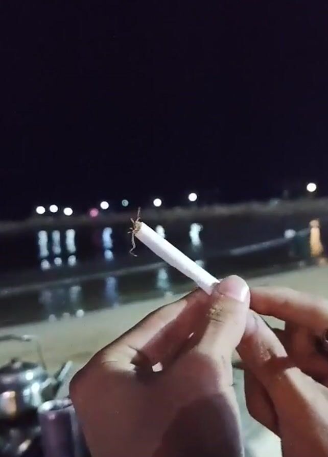 A person stands outside in the dark, holding a hand-rolled cigarette with a small insect on the end