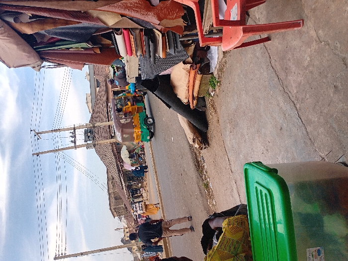 An outdoor scene captures a street with buildings and overhead electrical lines. On the right, a green container and a red chair sit on a sidewalk, next to a display of leather goods. In the background, people walk near a row of buildings. A three-wheeled vehicle is visible on the road. The sky is cloudy.