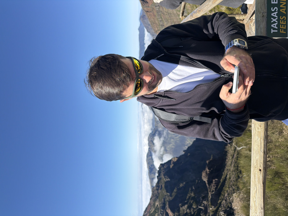 A male individual is depicted standing at an outdoor elevated location in Santana, Portugal, under a clear blue sky, overlooking a mountainous landscape where valleys are filled with a 'sea of clouds