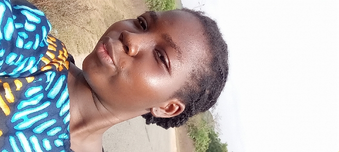 A woman with dark skin, short black hair, and a relaxed expression poses for a selfie outdoors. She wears a colorful patterned shirt with blue, yellow, and black hues. The background shows a landscape with sparse greenery, a dirt road, and a light sky. The angle is slightly tilted, giving a casual, candid feel to the photograph.