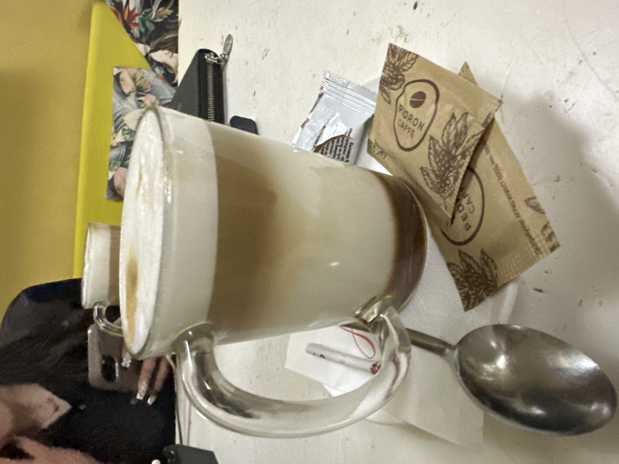 A photograph depicts an indoor scene in a cafe or restaurant located in Gabrovo, Bulgaria. The primary subject is a clear glass mug holding a layered coffee beverage, appearing to be a latte, with distinct strata of dark liquid at the base, lighter brown liquid, and a thick layer of white foam on top. The mug is positioned on a white tabletop. A silver spoon rests to the left of the mug. Directly beneath the mug's handle, a white paper napkin bearing a red 'A' insignia is visible. Two brown paper packets, labeled "PEDRON CAFFE," and one smaller silver packet are situated to the right of the mug. In the upper left background, a person with dark hair, wearing a dark garment, is partially visible, holding a rose-gold smartphone. Their right hand displays manicured nails with white tips. A delicate necklace adorns their neck. An out-of-focus second clear glass mug, mirroring the primary one, is positioned behind it. The background features a bright yellow wall or upholstered seating, a black zippered wallet, and a patterned cushion displaying tropical leaf motifs in green, pink, and blue hues.