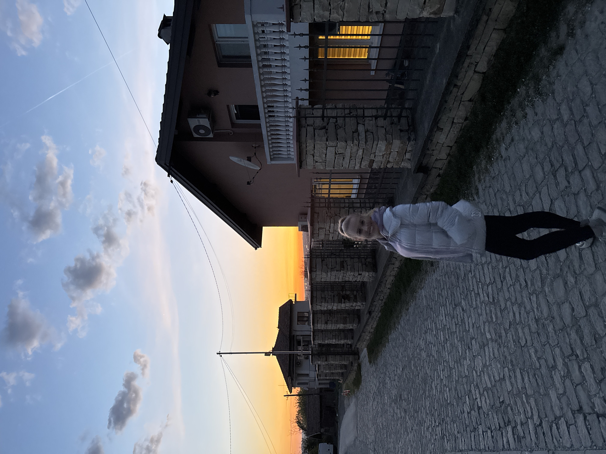 A photo of a person on a cobblestone street at sunset. The sky is blue fading to orange near the horizon with scattered clouds. Buildings line the street; one has a brown exterior, a balcony with white railings, and a black wrought iron fence. Electrical lines stretch across the sky. The person is wearing a white jacket and black pants. The photo is taken at an unusual angle, seemingly rotated 90 degrees.