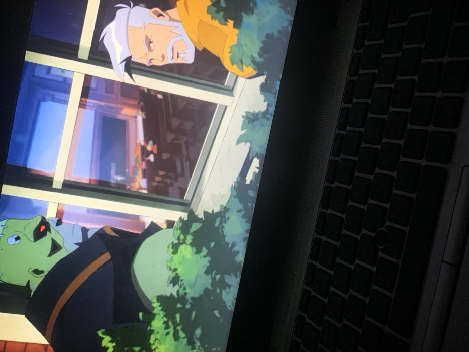 A laptop screen displays an animated scene. Two characters are visible: A green, humanoid character with a black coat, and a white-haired man with a grey beard and a yellow jacket. The characters are positioned on either side of a large window, and appear to be engaged in conversation. The window overlooks a classroom with desks and chairs, but the occupants are not visible. There are green bushes surrounding the characters, and a blackboard is visible inside the classroom. The background is a muted blue with a faint outline of a building. The scene is likely set in an urban environment, as suggested by the window, classroom, and the characters' attire. The laptop is placed on a dark surface. The coordinates provided (latitude: 4.893, longitude: 7.021) correspond to a location in Umuola, Nigeria. However, the scene depicted in the image is not relevant to the location. It is a fictional animation.