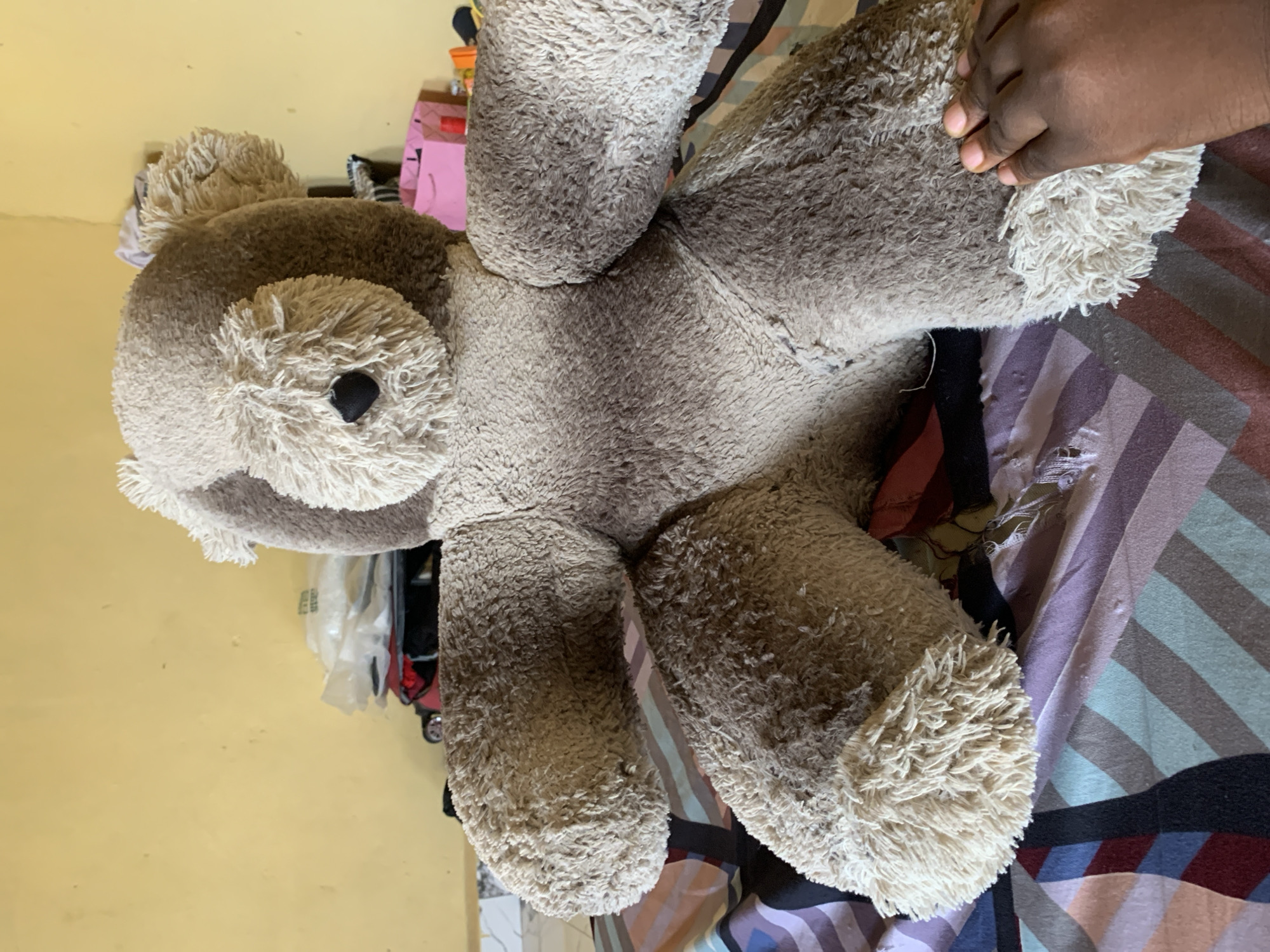 A gray, stuffed teddy bear lies on its back on a striped bedspread. A dark-skinned hand touches the bear. The photo was taken indoors, in Keffi, Nigeria.