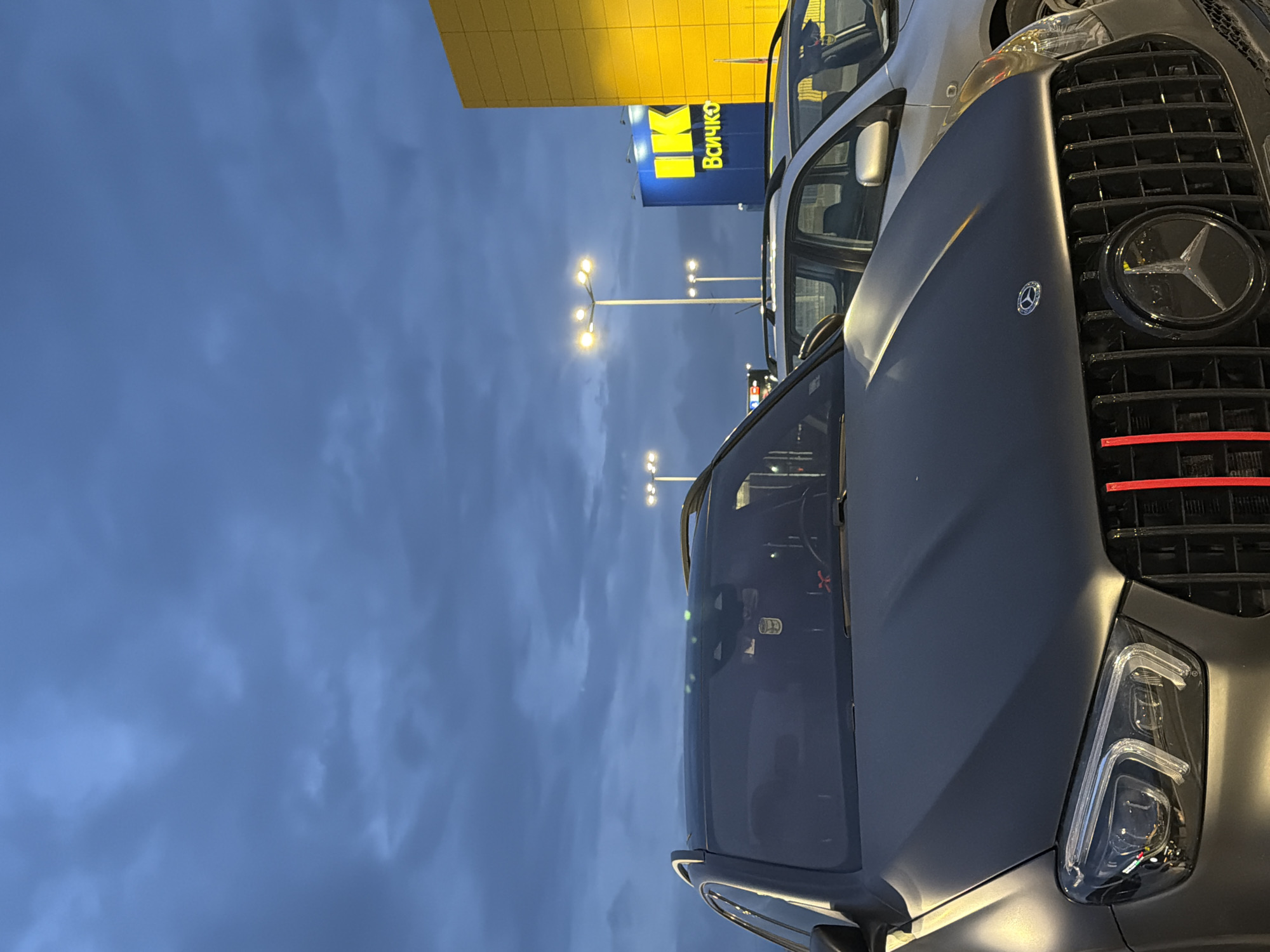 close-up of a matte gray Mercedes-Benz parked in front of an IKEA store under a dusk sky with streetlights