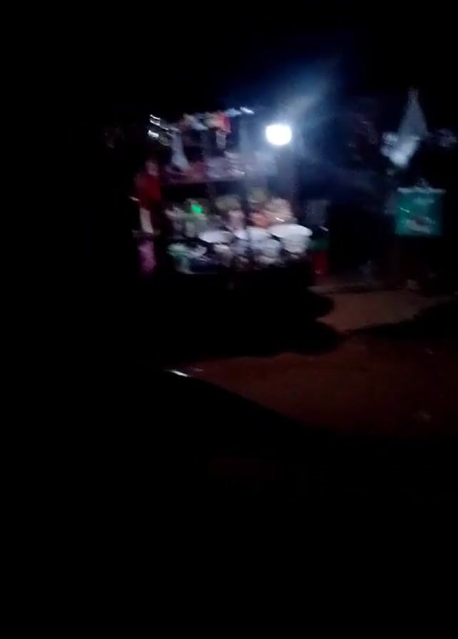 blurry, nighttime shot of a street with a small roadside shop or stall. The lighting is poor, primarily illuminated by a single bright bulb at the shop. We can see various items displayed at the stall, including what appear to be bowls or dishes. There is a green bag hanging near the stall and a couple of red chairs nearby. The ground is uneven, and overall, the setting appears to be a simple street-side scene at night. The video is shaky.