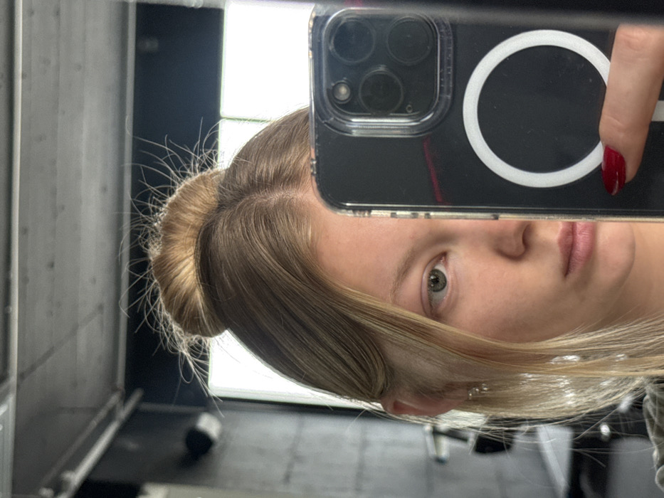The image depicts a mirror selfie of a female individual in an indoor setting in Katzrin, Israel. The subject, a woman with blonde hair, is partially visible, with her right facial profile (from the viewer's perspective) and the top of her head showing. Her hair is styled in a high bun, with several fine hairs protruding from the top. Her visible eye is green or hazel, and a faint pink eyeliner or eyeshadow is present on the lower lash line. A small, light-colored earring dangles from her ear. She holds a smartphone, specifically an iPhone model with a multi-lens camera array, encased in a clear case featuring a white circular MagSafe ring. A hand with a finger displaying red nail polish is visible holding the phone. The background, reflected in the mirror, shows a dark-colored or concrete ceiling and a bright, rectangular light source or window.