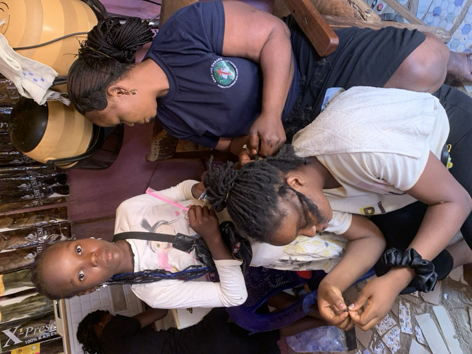 Within a hair salon in Garaku, Nigeria, three females are engaged in hair braiding activities