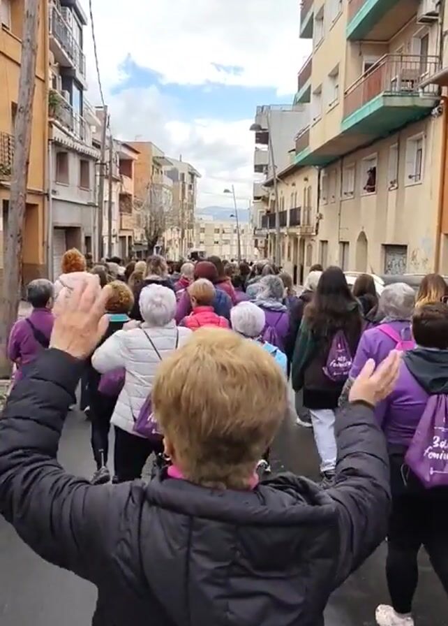 procession of people marching through a narrow street lined with buildings. The camera is positioned behind a woman who is part of the march, and her raised arms are visible in the foreground. Most of the participants wear purple clothing or carry purple bags, suggesting a theme or cause associated with the color. The buildings on either side of the street vary in height and architectural style, with a mix of balconies and window designs. The street appears wet, indicating it may have recently rained. In the distance, the street leads towards a brighter area, suggesting an open space or town square. The sky is partially cloudy, casting a soft light over the scene. The overall atmosphere suggests a community event or demonstration taking place in a European town.