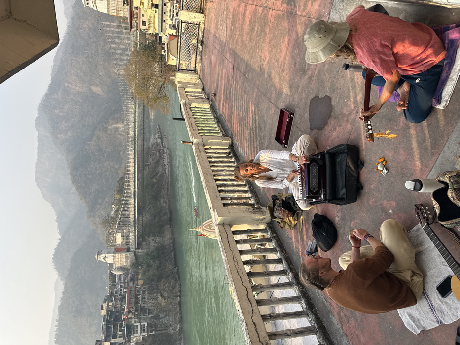 The image displays three individuals on a reddish-brown concrete rooftop terrace in Rishikesh, India, overlooking the Ganges River
