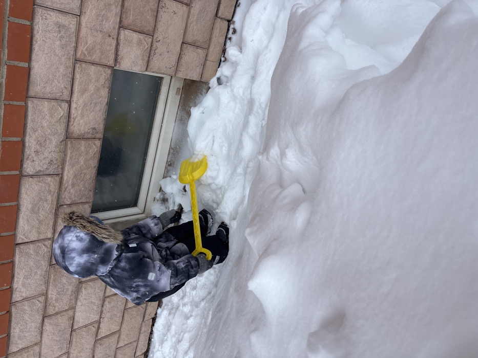 An aerial shot depicts a child in a hooded jacket and black pants shoveling snow next to a window. The window is set in a brick wall. The snow forms a large mound, dwarfing the child and their yellow plastic shovel. The perspective is from above, looking down at the scene, which is oriented diagonally.