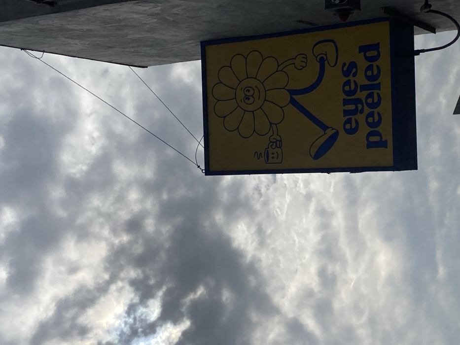 A sign for "Eyes Peeled" hangs against a cloudy sky and the edge of a building