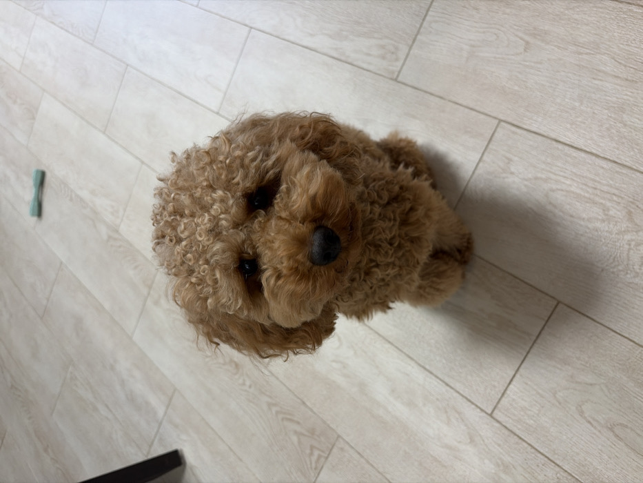 - "A tan-colored, curly-haired poodle lies on a light-colored, wood-patterned floor" by FM-FZBdJ2, licensed under CC BY 4.0