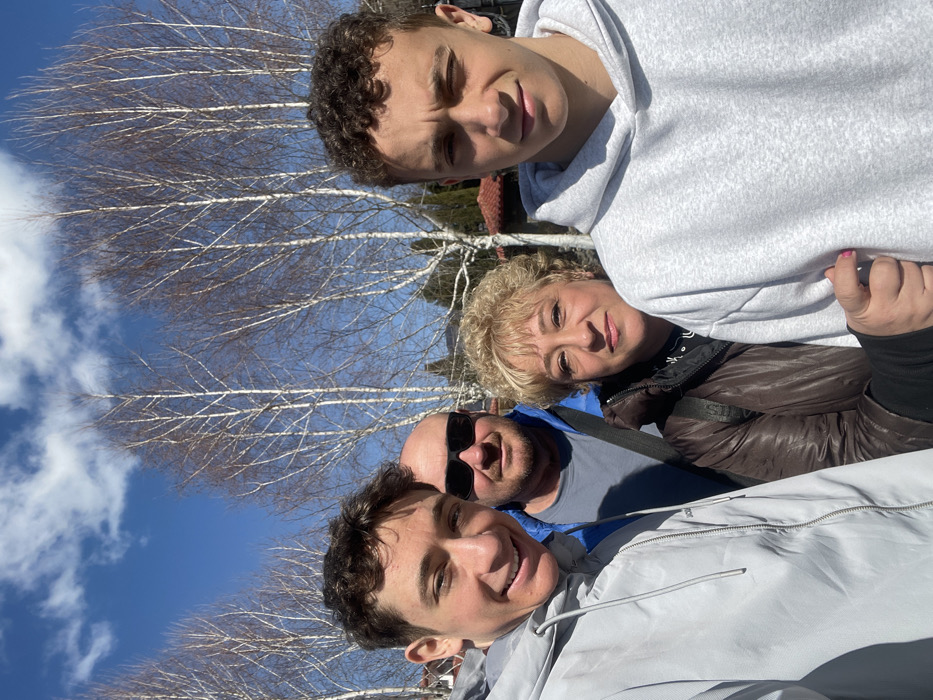 The image captures four individuals posing outdoors in Skobelevo, Bulgaria, under a clear blue sky with scattered white clouds. The background consists primarily of numerous leafless deciduous trees and distant hills, with partial views of buildings featuring red-brown roofs. From the left, a young male with short dark wavy hair smiles directly at the camera, wearing a light grey hooded jacket with a visible zipper. Behind him and to his right, an adult male with a bald head wears dark sunglasses and a blue jacket over a grey shirt; a dark strap from a bag is visible over his right shoulder. Centrally positioned behind the two young males is an adult female with short, curly blonde hair, gazing directly at the camera with a slight smile; she is dressed in a brown puffer jacket over a black garment, and her right hand rests on the left arm of the young male to her right. The young male on the right has short dark curly hair and a neutral expression, looking towards the camera, while wearing a light grey hooded sweatshirt.