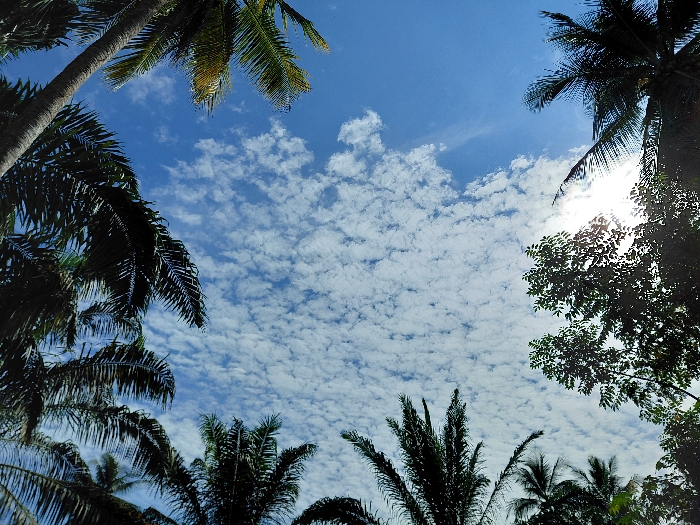 An upward-angle photograph captures a blue sky populated by numerous small, white altocumulus clouds. The sky is framed by dark, silhouetted foliage from tropical trees. Prominent palm fronds and a partial palm trunk extend into the frame from the left and upper-left. Denser, broadleaf tree canopy and additional palm fronds are visible along the right side and bottom of the image. A strong sun flare is present in the upper-right quadrant, emanating from behind the tree canopy. The scene is located in Keude Cunda, Indonesia.