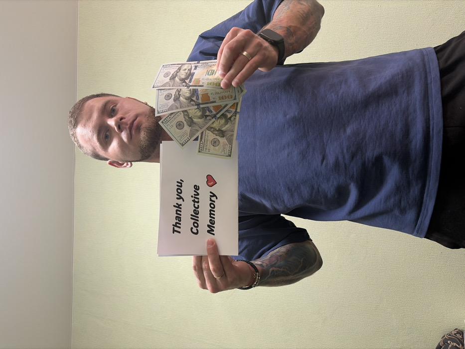 A male individual is depicted indoors in Chaikovsky, Russia, standing against a plain, light green wall. The subject, a Caucasian male with short light brown hair and a beard, is wearing a blue short-sleeved t-shirt and dark pants. He has a gold-colored ring on his left ring finger, a dark multi-strand bracelet on his left wrist, and a dark smartwatch on his left wrist. His left arm is extensively tattooed with blue and black ink. He holds a white rectangular sign in his left hand, displaying the black text "Thank you, Collective Memory" followed by a red heart emoji. In his right hand, he holds a fan of five $100 US dollar banknotes, with the fronts of multiple bills clearly visible. He looks directly at the camera with a neutral expression.