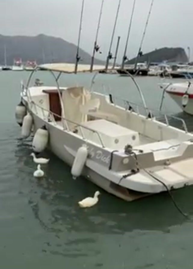 The video depicts a small harbor on a cloudy day. Several boats are moored in the water, with a light gray boat labeled "Moby Dick" in the foreground. This boat has multiple fishing rods attached to its rear. Three white ducks are seen swimming close to the "Moby Dick" boat. One other duck, brown in color, is seen further out in the water. In the background, other boats and what appears to be a mountainous or hilly terrain can be seen. The water is greenish-grey.