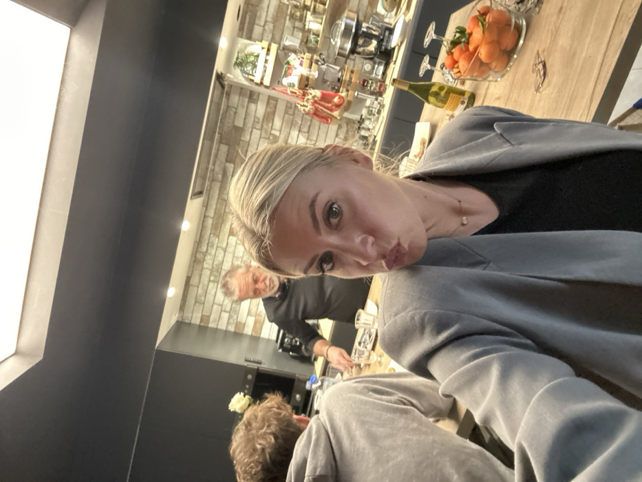 The image depicts an indoor scene within a modern kitchen in Saint-Médard-en-Forez, France. In the foreground, a blonde female with her hair pulled back and wearing a grey blazer over a dark top is captured in a selfie, with her lips puckered. To her left, the back of a person with curly brown hair, wearing a grey hooded sweatshirt, is visible at a wooden countertop. In the background, an older male with grey hair and a beard, wearing a dark long-sleeved shirt, stands behind the counter, looking down at objects on its surface. The kitchen features dark grey cabinetry, a light-colored brick-patterned backsplash, and a skylight in the ceiling. Visible items on the wooden countertop include a white flower in a vase, place settings with glasses and cutlery, a black coffee machine, a large glass bowl containing mandarins or oranges, a green-labeled bottle (consistent with wine), and a silver kitchen appliance. Various jars and decorative elements are arranged on shelves against the backsplash.
