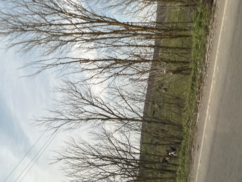 The image depicts a rural scene in Zlatinitsa, Bulgaria, viewed from a roadside. In the immediate foreground, a grey asphalt road runs horizontally. Above the road, a strip of green grass and sparse vegetation precedes a dense line of bare deciduous trees with thin, brown branches, characteristic of late winter or early spring. Through and beyond these trees, a gently sloping green hillside is visible. Scattered across this hillside is a herd of approximately 15-20 cattle, varying in coloration including black, white, brown, and spotted patterns, appearing to graze. In the background, on the upper part of the hillside, several tall, metallic lattice structures, identified as power transmission towers, stand against a partly cloudy sky of light blue and white. Two dark, thin power lines are discernible in the upper left quadrant of the sky, running horizontally. The overall environment suggests an agricultural or pastoral landscape with visible modern infrastructure.