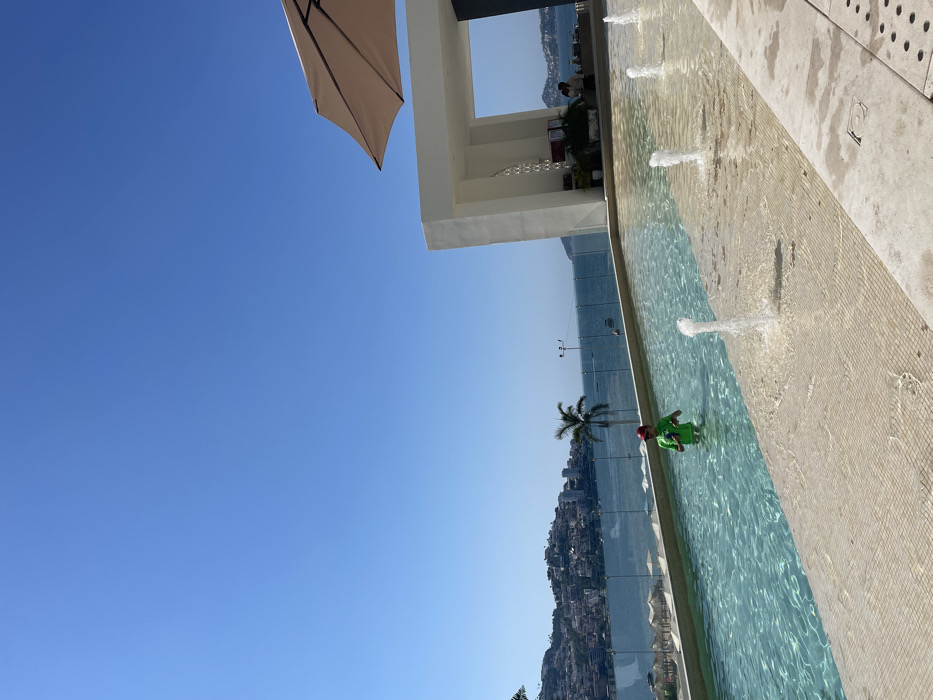 A view of a city coastline with a body of water. A person wearing a green suit is in the water, near a palm tree. Fountains are spouting water into the pool. A building with white columns and a tan umbrella are visible. Clear blue sky with no clouds is also visible. The photo is taken at an angle, giving a tilted perspective.