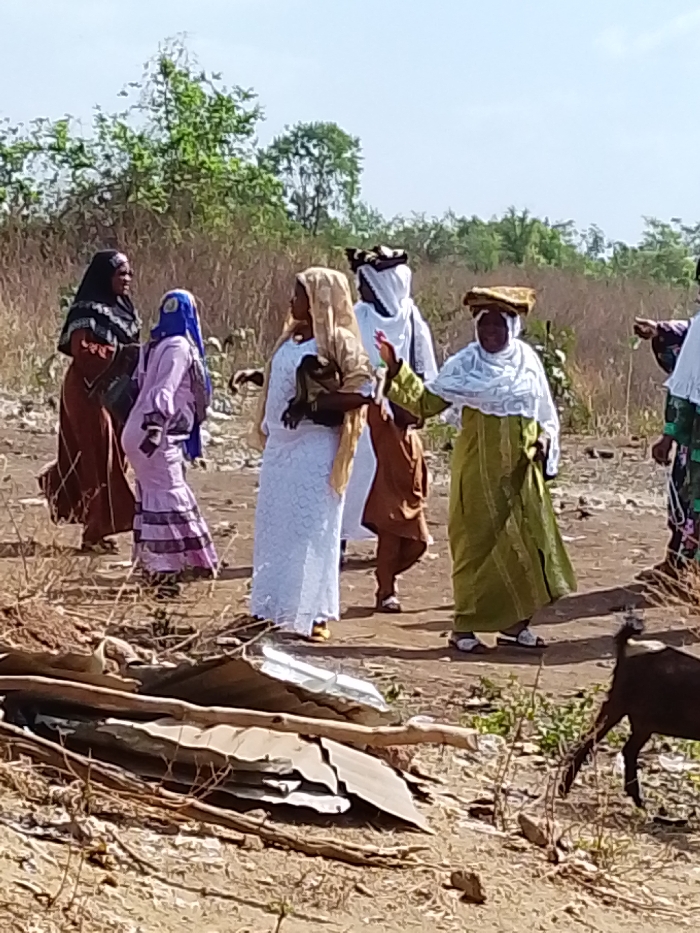 The scene is set outdoors on Oduma Hill, Nigeria, under a clear, bright sky. Six individuals, predominantly women, are present on a dry, light brown dirt path with sparse vegetation. In the foreground, scattered debris includes crumpled corrugated metal sheets and several tree branches. From left to right: 1. A woman in a dark brown patterned dress and black head covering stands, facing right. 2. A woman wearing a light purple dress and a blue head covering walks right. 3. A woman in a long white dress and a light tan head covering carries a dark, bundled object in her arms while moving right. 4. Behind her, a person in a white robe with a patterned black and white head covering, wearing brown trousers, also proceeds right. 5. A woman in an olive green long dress, a white head covering, and a flat, woven object on her head extends her right arm forward in a gesturing motion. 6. To the far right, a partially visible woman in a green patterned garment and white head covering extends her right arm, pointing towards the right. A dark-colored goat is partially visible in the lower right corner, moving towards the right. The background features dense, dry scrub vegetation and trees.