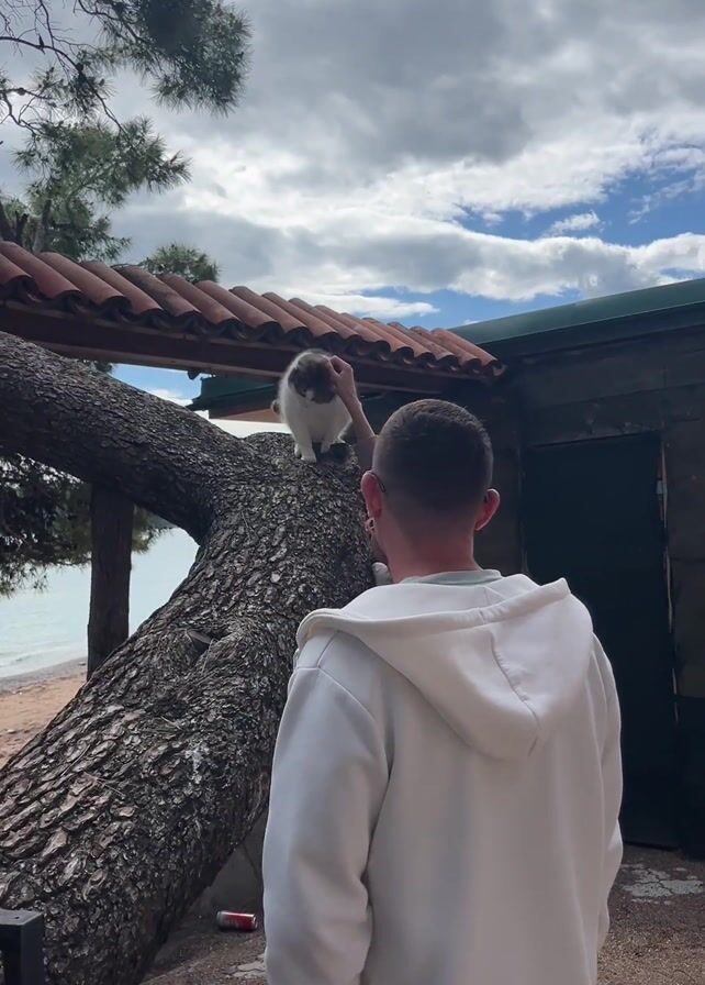 A low-angle shot shows a woman petting a white and gray tabby cat perched on the thick, textured branch of a tree. The woman is wearing a white jacket. A man in a white hoodie stands nearby. The tree branch extends from the right towards a beach and a building with a reddish-brown tiled roof. The beach and ocean water can be seen in the background, with a partly cloudy sky overhead.
