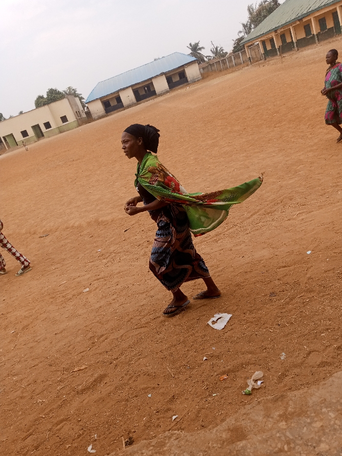 The scene depicts an outdoor, unpaved area, likely a school ground, within the city of Akwanga, Nigeria, under an overcast sky. The ground consists of reddish-brown earth with scattered debris, including several pieces of white paper/plastic. In the foreground, slightly left of center, a woman is captured in a dynamic pose, suggesting movement to the left. She wears a black headscarf, a dark top, and a patterned long skirt/wrapper with blue, white, and brown geometric designs. A green patterned shawl, featuring red/orange floral motifs, is draped over her shoulders and appears lifted by wind or motion. Her hands are held close to her chest, and her mouth is open. She wears dark flip-flops. In the mid-ground, further to the right, a second woman is visible, partially obscured and also in motion, wearing a patterned dress. To the far left, only the lower legs and feet of a third individual, wearing patterned trousers and sandals, are partially visible. In the background, two single-story buildings are present. The left building is light-colored with dark rectangular windows. The right building is also light-colored, featuring dark windows and a prominent light blue corrugated metal roof. Trees and a low fence are visible behind the buildings.