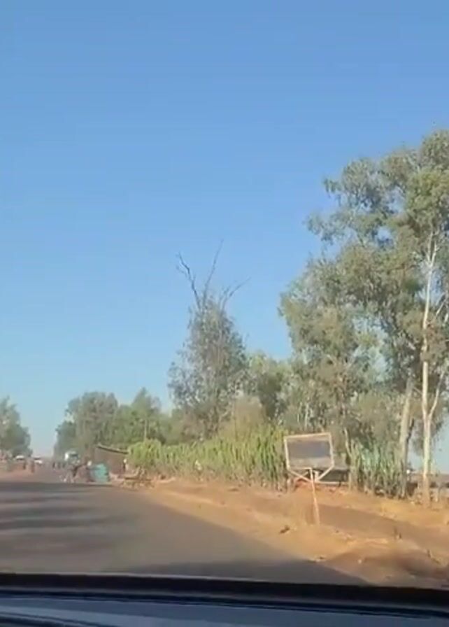 A car is driving down a road in a rural area. The road is paved and has dirt shoulders on either side. There are buildings and trees on both sides of the road. There are people walking on the side of the road. The sky is blue.