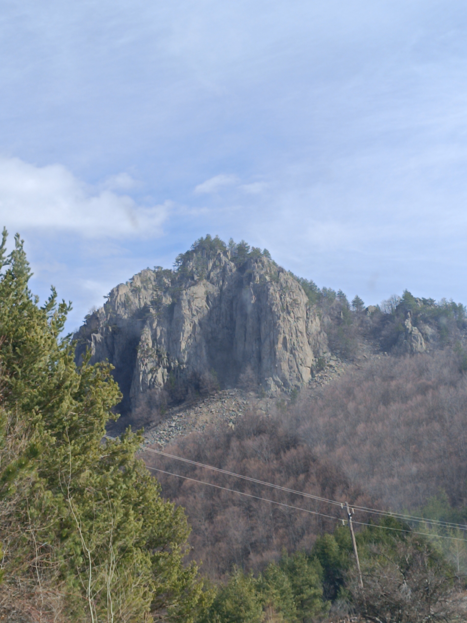 mountain in the city of Vrata, Bulgaria. The mountain is rocky with some trees on its peak and flanks. A large pine tree occupies the left side of the image. Below the rocky mountain are trees in an autumn state with bare branches. Utility poles with overhead wires are visible in the lower right side of the image. The sky is partly cloudy.