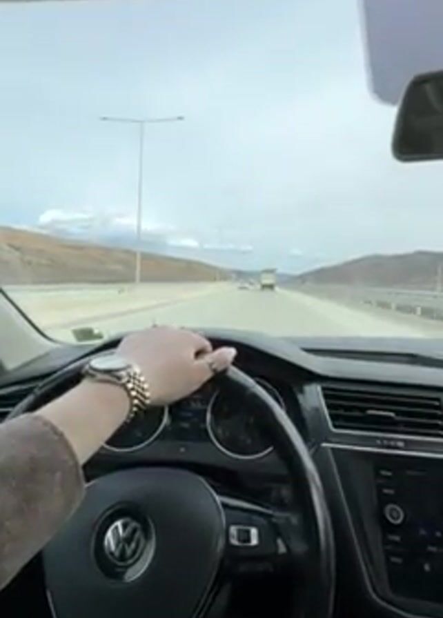view from the driver's seat of a car driving on a highway. The driver, wearing a watch and rings, has their left hand on the steering wheel. The highway has multiple lanes and is flanked by hills and mountains in the distance. There are streetlights along the side of the road. Other vehicles can be seen further ahead on the highway. The sky is overcast.