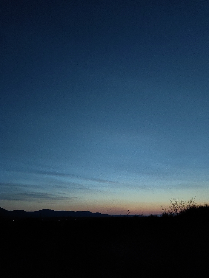 The image displays an outdoor twilight scene, likely capturing either dawn or dusk, with an expansive sky over a landscape near the city of Ruets, Bulgaria. The upper portion of the frame features a deep navy blue sky, gradually transitioning to a lighter blue-grey mid-section. A narrow band of orange, pink, and yellow hues is present at the horizon, indicating atmospheric light refraction. Wispy, horizontal cloud formations are faintly visible across the lighter blue sky. A prominent, dark silhouette of mountains or hills stretches horizontally across the mid-ground, below the colored horizon band. Beneath this mountain range, several small, scattered points of light are visible, identifying the distant city of Ruets. The foreground, occupying approximately the lower quarter of the image, is rendered in deep shadow, appearing almost entirely black and obscuring ground details. On the far right of the foreground, the silhouetted outline of bare tree branches or shrubs is discernible against the lighter horizon. No human figures, animals, or explicit man-made structures other than the distant city lights are visible.
