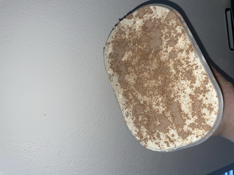 The scene, located in Saverne, France, features an oval-shaped, translucent plastic container held by a partially visible human hand. The container is filled with a light-colored, creamy dessert substance, generously and unevenly dusted with a granular brown powder, consistent with cocoa. The background is a white, textured ceiling, exhibiting a stucco or heavily painted finish with a single dark speck visible towards the upper center. No other individuals, objects, or actions are discernible within the frame.