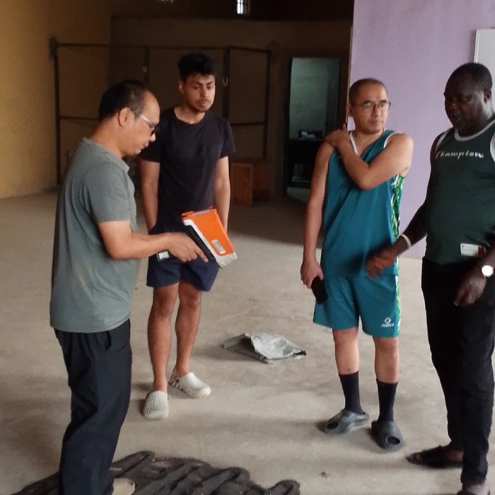 Four men stand in a room with light-colored walls and floors. One man in a gray t-shirt and dark pants holds an orange device. To his right, a younger man wears a black t-shirt and blue shorts. The third man, wearing glasses and a blue athletic uniform, holds his shoulder. The fourth man, with dark skin, wears a Champion tank top and dark pants. Various items lay scattered on the floor around the men.