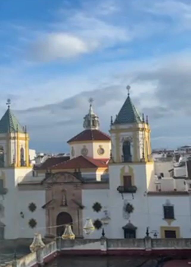 view of a white and yellow church with two towers, a dome, and a cross on top of each. The sky is blue with some clouds. The church is in the middle of a city with white buildings. There is a red roof below the camera. The sound of church bells can be heard.